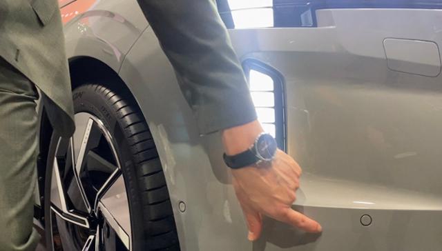페이지씨는 먼저 헤드라이트 아래 공간을 가리키며 "이 안에 들어있는 초음파 센서는 페인트를 투과해 물체를 감지한다"고 설명했다. 좌우로 2개씩 보이는 앞 범퍼 위 동그란 모양 네 곳과 그사이 위치한 초음파 센서 6개를 확인할 수 있었다.
