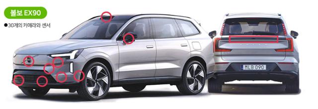 이 많은 카메라와 레이더, 센서는 전부 어디에 있을까 궁금해졌다. 30개의 센서를 직접 찾아보기로 했다. 전면 유리와 지붕 사이에 자리 잡은 라이다를 포함해 5개는 쉽게 찾을 수 있었다. 먼저 차량 앞쪽 아래 '볼보 마크'를 들여다보면 카메라와 레이더가 나란히 있다. 오른쪽 레이더는 비 오는 날 와이퍼를 가동하면 위로 올라와 옆 카메라를 닦아주기도 한다.