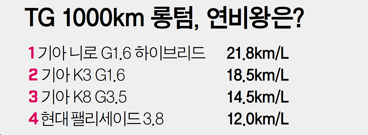 밤 11시, 계산대로 서울에 도착하면서 누적 주행거리 1000km를 모두 채웠다. 대망의 누적 연비는? 총 21시간 동안 1034.8km를 주행하며 휘발유 1L로 12.0km를 달렸다. 앞서 언급한 팰리세이드 차주의 말보단 낮았지만(원래 차주들은 과장을 좀 한다), 커다란 SUV로써 만족스러운 결과다. 실제 주유 결과도 크게 다르지 않았다. 두 번 주유로 모두 86.85L를 넣어 1L에 11.96km 결과가 나왔다.