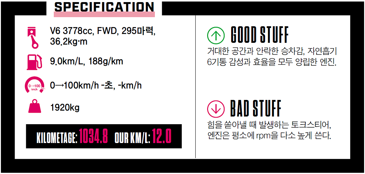 그러나 경주를 돌아다닐 때 연비는 아주 나빴다. 가다 서다 반복하는 시내 주행에서 연비가 뚝뚝 떨어지고, 오르막 내리막 굽잇길 효율 역시 좋지 않다. 시승차 촬영을 위해 잠시 정차했을 때도 다른 차보다 누적 연비 수치가 가파르게 내려간다. 숨만 쉬어도 기름을 들이켜는 3.8L 엔진과 1.9t 넘는 덩치의 업보다. 더욱이 낮은 rpm에서 토크가 약한 앳킨슨 사이클 특성 때문인지, rpm을 다소 높게 유지하는 경향도 엿보였다.