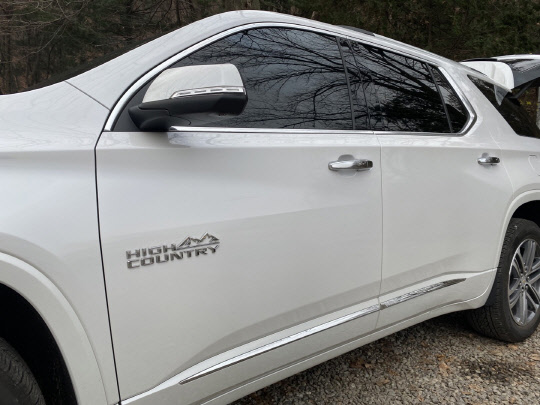 쉐보레 트래버스 하이컨트리 트림 좌측 1열 도어의 하이컨트리 앰블럼. 장우진 기자