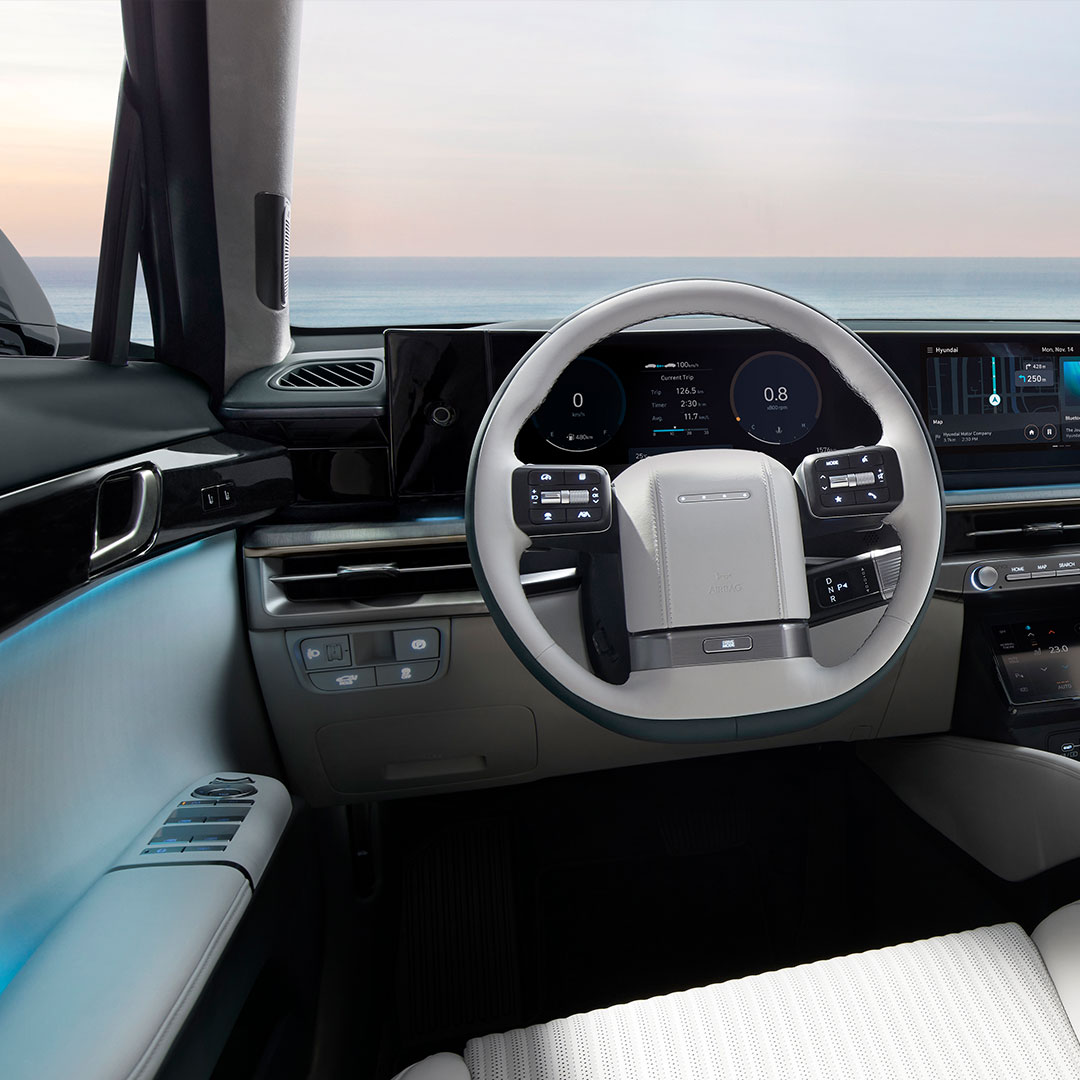 인테리어는 고급스러우면서 넉넉하다. 실내 전면의 12.3인치 계기반과 내비게이션이 길게 장착됐고, 중앙 하단에는 공조기를 조작하는 10.25인치 터치스크린이 자리한다. 스티어링휠(운전대)은 1세대 그랜저의 디자인에서 영감을 받아, 조작계를 통합한 형태로 재탄생했다.