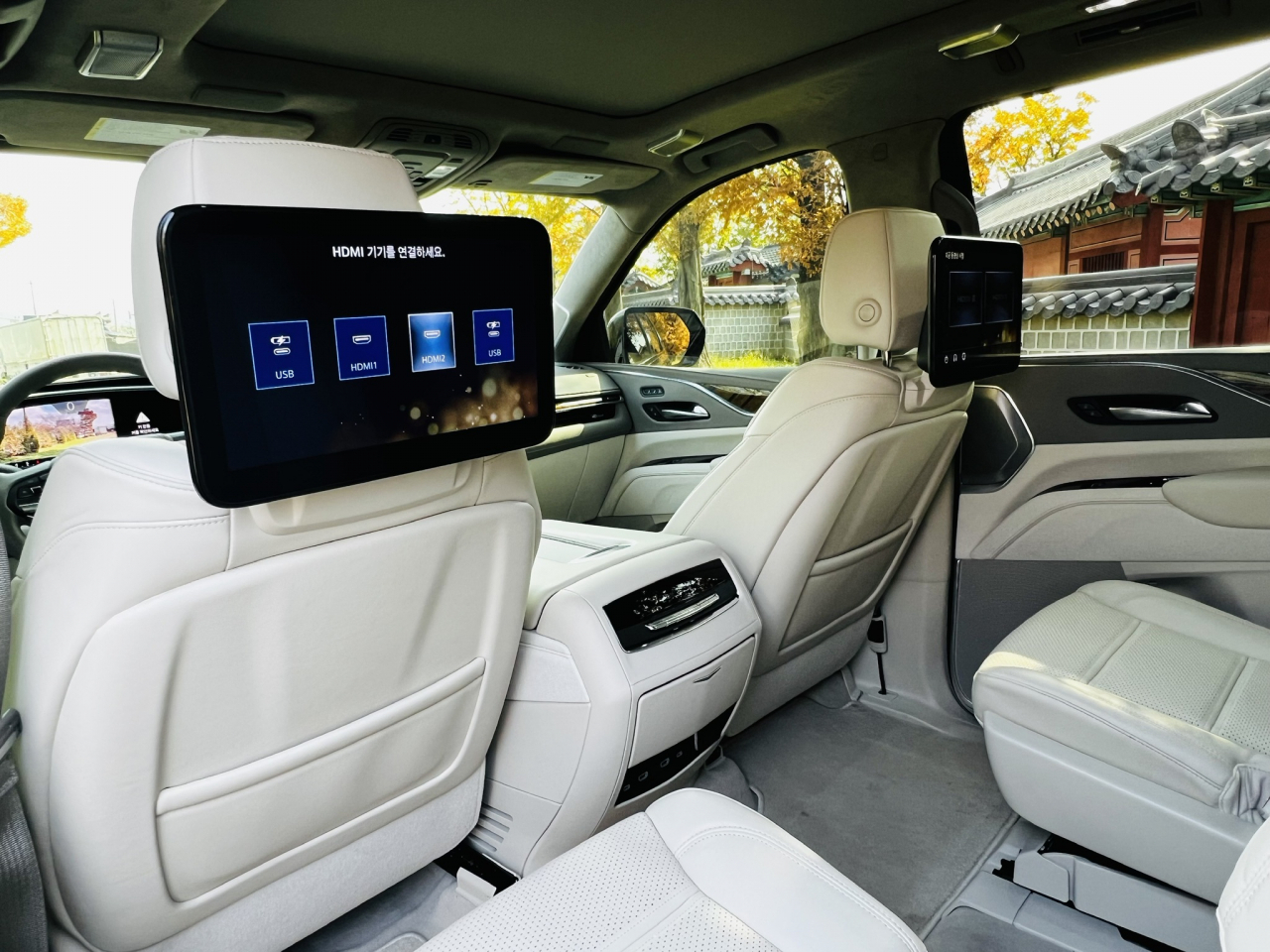 고급차에서 기대할 수 있는 중요한 요소는 바로 ‘소리’다. 에스컬레이드는 헤드폰 브랜드로 익숙한 AKG 스튜디오의 레퍼런스 사운드 시스템을 탑재했다. 스피커 유닛만 36개다. 앞좌석과 뒷좌석에서 뿜어져 나오는 소리가 실내 공간의 중앙에서 뒤엉켜 새로운 타격감을 느끼게 한다. 두꺼운 도어로 인한 정숙성이 음악의 미세한 소리까지 놓치지 않게 돕는다.