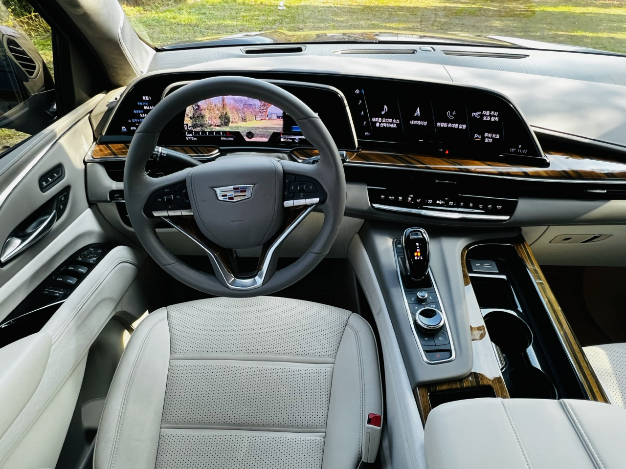 2m에 달하는 차(전고 1945㎜) 옆에 서니 키가 한없이 작게 느껴진다. 창피함을 숨기려 허벅지에 힘을 실어 빠르게 올라탔다. 차급에 걸맞은 고급스러운 실내가 눈에 들어온다. 최고급 가죽과 우드, 패브릭 소재로 짜인 완성도가 만족스럽다. 세 영역으로 나뉜 38인치 LG 커브드 OLED 디스플레이도 호화롭다. 전방 상황을 보여주는 디지털 클러스터는 지금까지 경험하지 못했던 혁신을 느끼게 했다. 크게 활용도가 없는데도 계속 멍하니 보게 된다. 여기에 헤드업 디스플레이(HUD)와 왼쪽 정보 패널, 그리고 콘텐츠를 이용하는 중앙 디스플레이까지 캐딜락이 보유한 첨단 기술을 쏟아부은 모습이다.