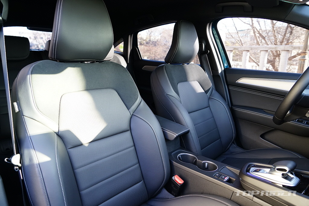 블랙 투톤 루프와 아웃사이드 미러, 하이글로시 B필러와 벨트라인은 인스파이어 디자인 패키지 사양이다. 날렵한 쿠페형 보디와 투톤 18인치 휠은 어울림이 좋다. 실내는 블랙 가죽시트 패키지가 적용돼 1열 파워 및 통풍시트, 앰비언트 라이트, 2열 열선시트가 포함된다.