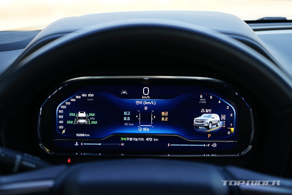타호는 전장 5350mm, 전폭 2060mm, 전고 1925mm, 휠베이스 3071mm의 차체를 자랑한다. 오래된 주차장을 주로 이용한다면 내리기 어려울 수 있는 크기다. 도시 외곽 주행에서는 도로 밖 풍경을 언제나 즐길 수 있는데, 높은 전고로 인해 시선이 가드레일 위에 머문다.