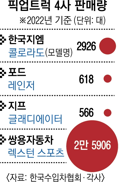 쌍용차는 척박한 환경에서도 ‘국산 픽업트럭’의 명맥을 이어 오고 있다. 1963년 쌍용차의 전신인 ‘하동환자동차공업’에서 만들었던 ‘HDH픽업트럭’을 선보인 바 있으며 이후 ‘무쏘’, ‘액티온’ 등 주요 모델들의 이름에 ‘스포츠’를 붙여 픽업트럭으로 출시했다. 2018년부터는 ‘렉스턴’의 픽업트럭 버전인 ‘렉스턴 스포츠’가 국산 모델답게 최대 4000만원을 넘지 않는 ‘가성비’를 앞세웠다. 사실 ‘국내 픽업트럭 시장 규모는 렉스턴 스포츠의 판매량과 일치한다’는 말이 유효할 정도로 점유율 자체는 압도적이다.