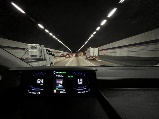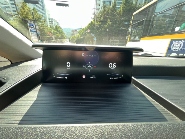 스티어링 휠 뒷편에 배치된 클러스터 차량에 익숙해 처음엔 낯설었지만 금새 적응됐다. 오히려 클러스터가 대시보드 위에 돌출형으로 올라와 잇다보니 주행하면서 LCD화면을 확인하는 것이 더욱 수월했다. LCD 클러스터가 운전자와 적당한 거리에 위치해 있는데다 대시보드 높이도 낮아 헤드업 디스플레이(HUD)를 보는 듯한 효과를 냈다.