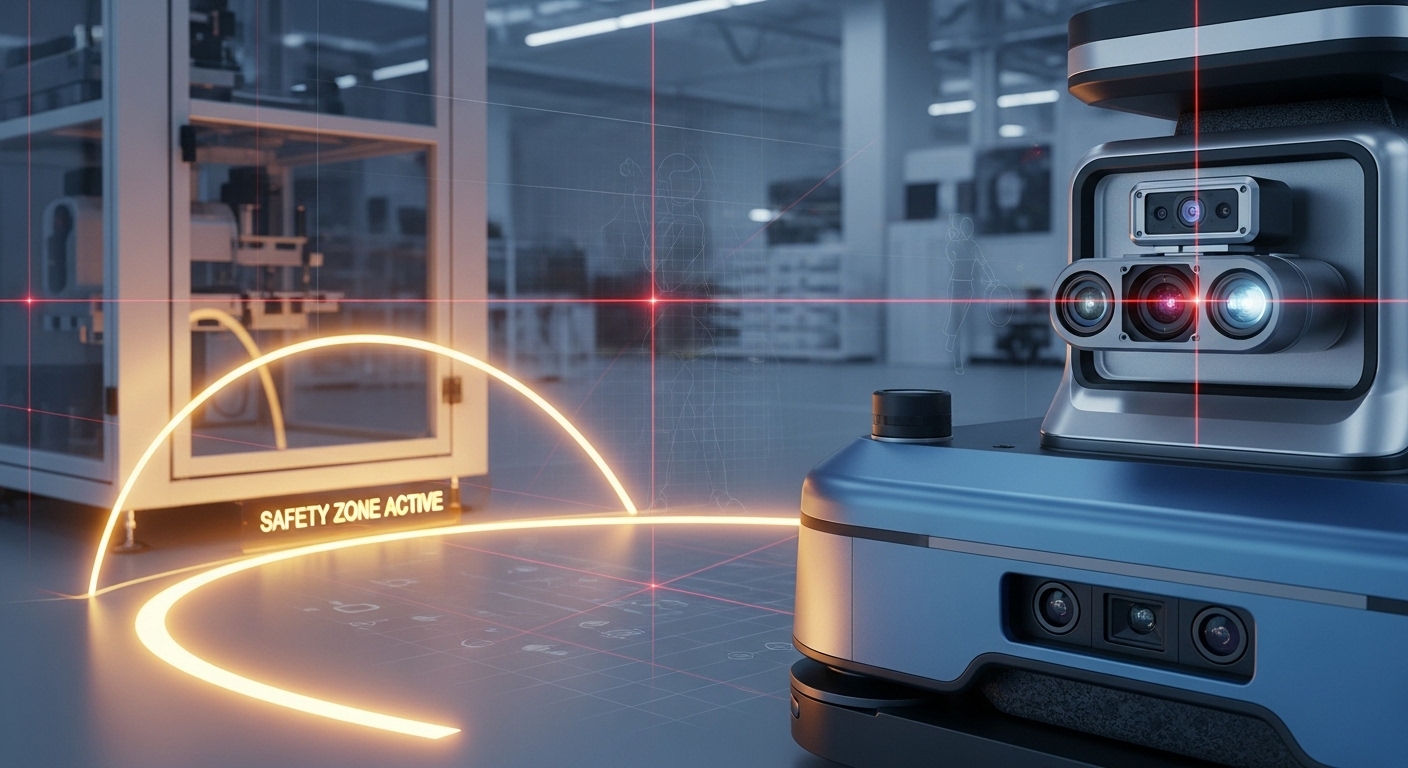 장애물을 감지하고 안전하게 이동하는 자율주행로봇(AMR)의 센서 시스템과 경로 탐색 모습.