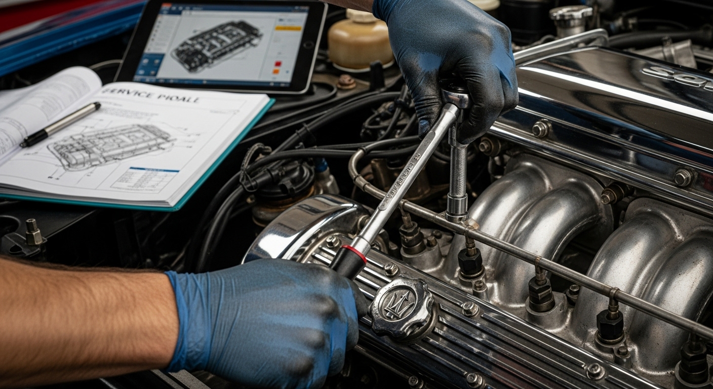 마세라티 콰트로포르테 엔진룸을 정비하는 숙련된 정비사의 손