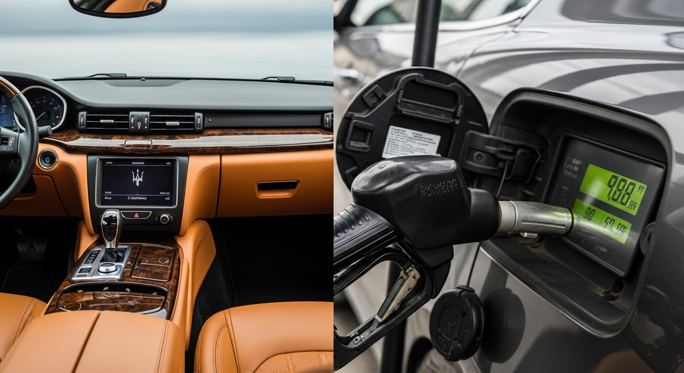 마세라티 콰트로포르테의 럭셔리한 내부와 높은 주유 비용을 보여주는 이미지
