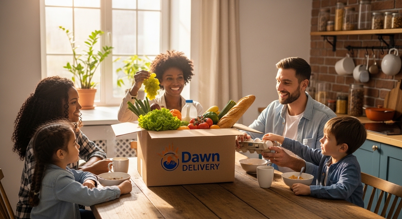 새벽에 배송된 신선한 식료품을 가족이 함께 아침 식탁에서 즐겁게 정리하는 모습