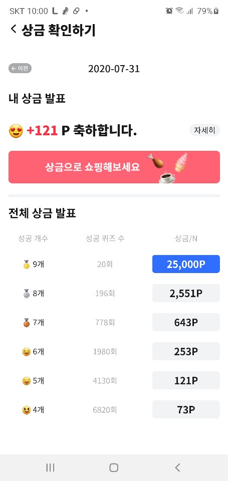자 보자 오늘 7개를 맞추면 643P, 8개면 2,551개, 9개면 25,000P