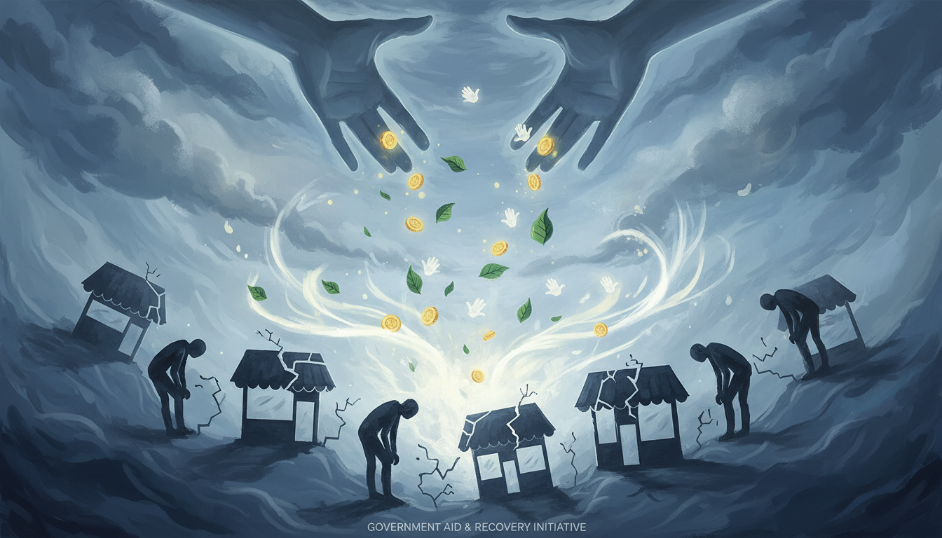 정부가 소상공인과 국민에게 경제적 지원을 제공하는 모습을 추상적으로 표현한 이미지