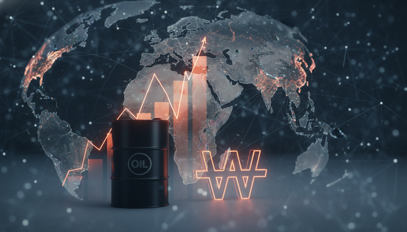 중동발 경제 위기로 인한 국제 유가 급등과 한국 경제의 불안정성을 상징하는 역동적인 이미지