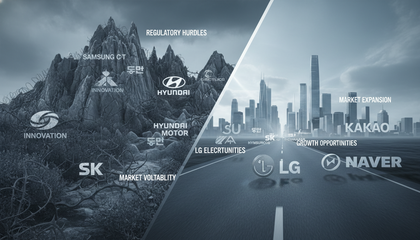 미국 시장 진출을 앞둔 한국 기업들이 마주할 도전과 기회를 상징하는 이미지