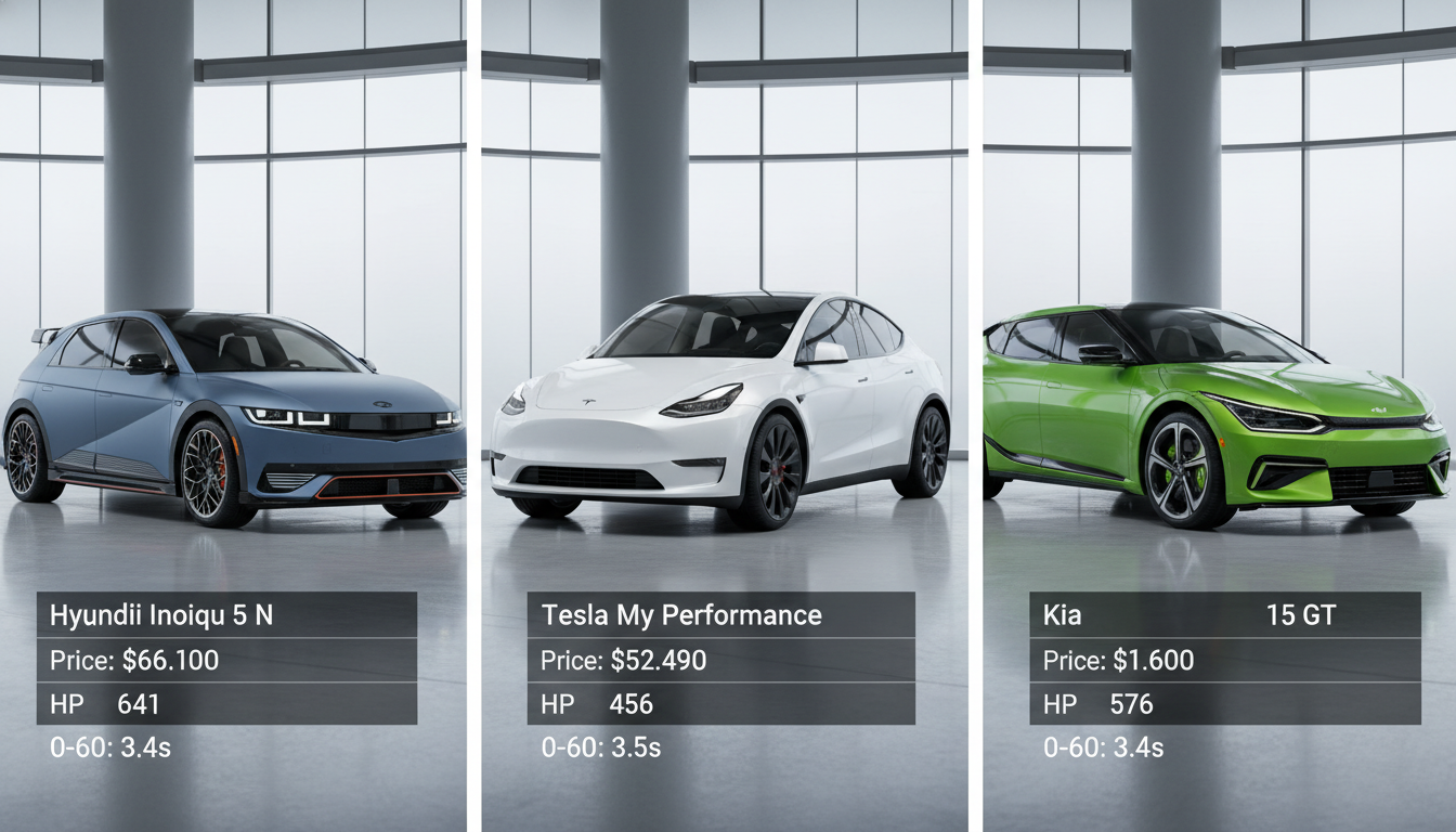 아이오닉 5 N의 강력한 성능과 매력은 분명하지만, 같은 예산으로 다른 고성능 전기차를 고려해 볼 수도 있습니다. 대표적인 경쟁 모델인 테슬라 모델 Y 퍼포먼스와 기아 EV6 GT를 아이오닉 5 N과 비교해 보겠습니다. 역시 2026년 기준, 옵션 포함 가격과 함께 각 차량의 특징을 살펴보죠.