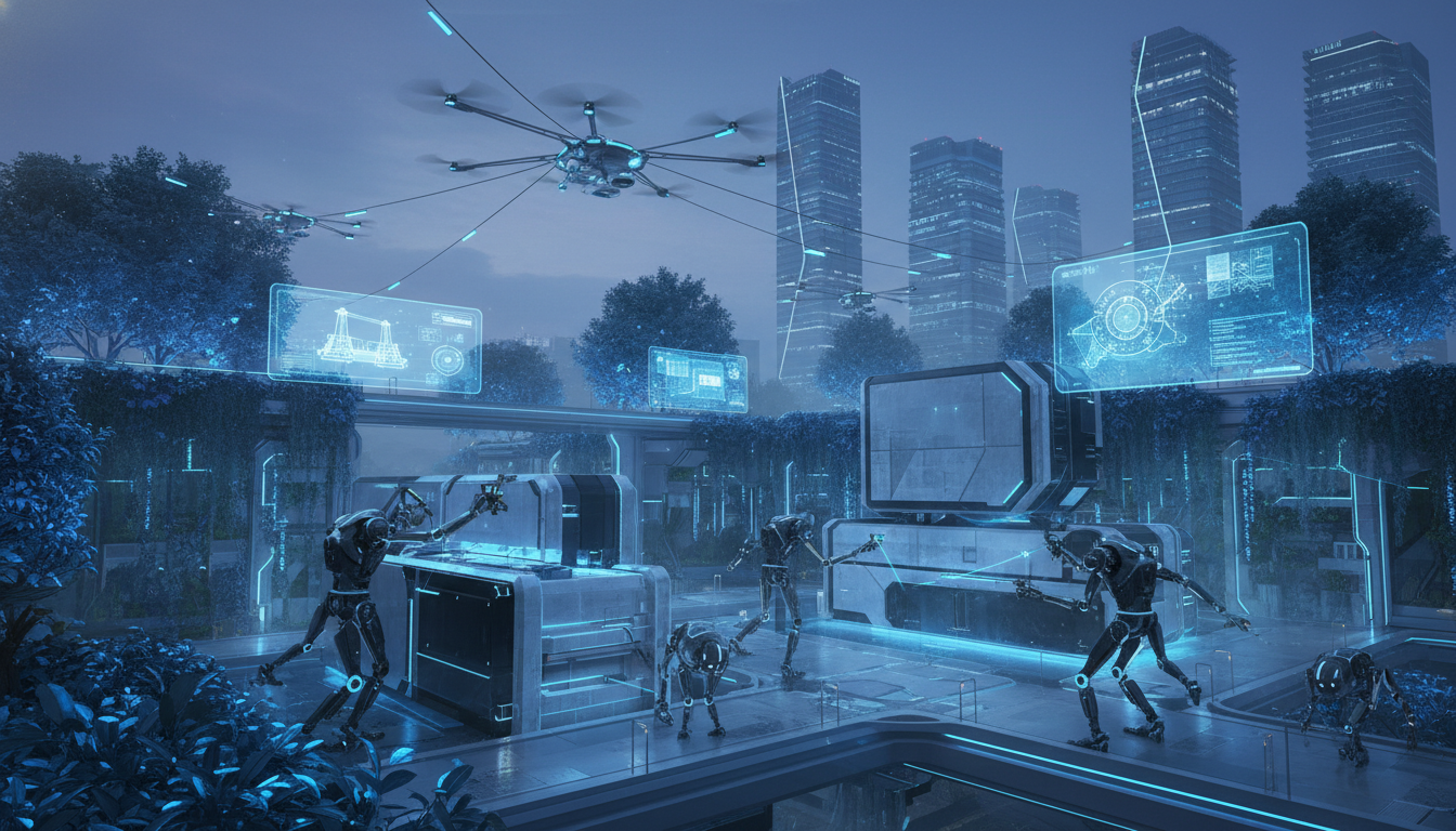 첨단 기술로 지어지는 미래형 건설 현장. 로봇들이 자재를 운반하고 조립하며, 드론이 상공에서 작업을 감독하는 모습