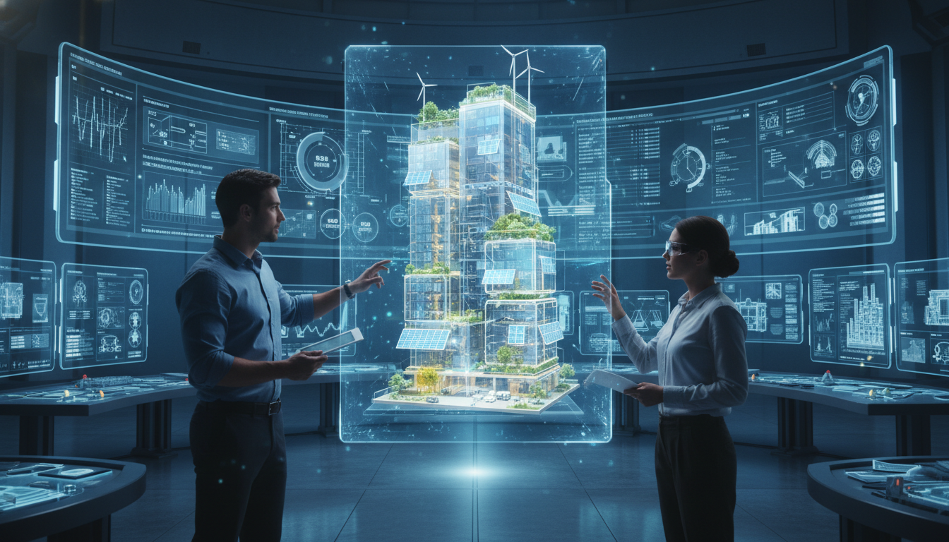 태양광 패널, 옥상 정원 등 친환경 요소를 통합한 스마트 도시 건물 디자인의 3D 홀로그램