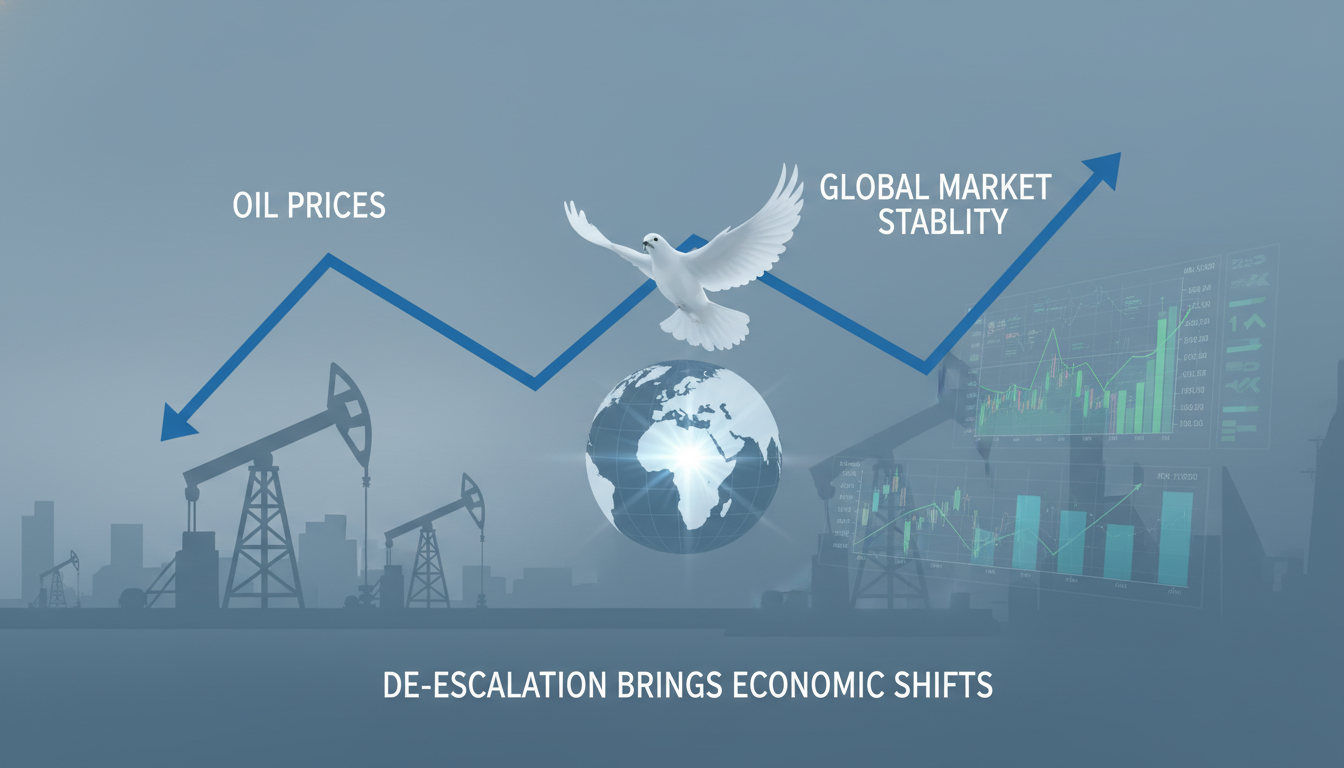 중동 긴장 완화로 인한 국제 유가 하락 및 세계 경제 안정화 가능성을 나타내는 그래프와 유전 이미지가 결합된 시각 자료