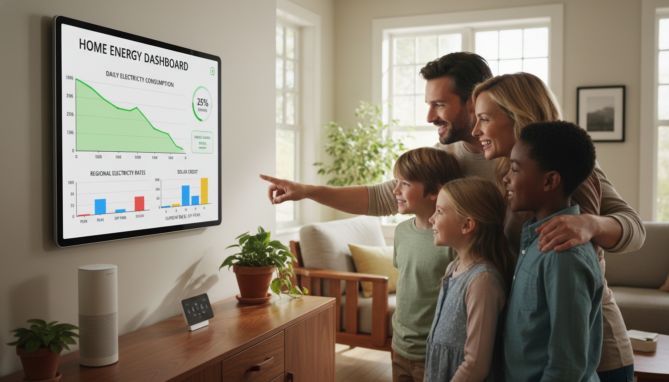 가족이 가정의 전기 소비량과 절약 현황을 보여주는 스마트 디스플레이를 보며 대화하는 모습