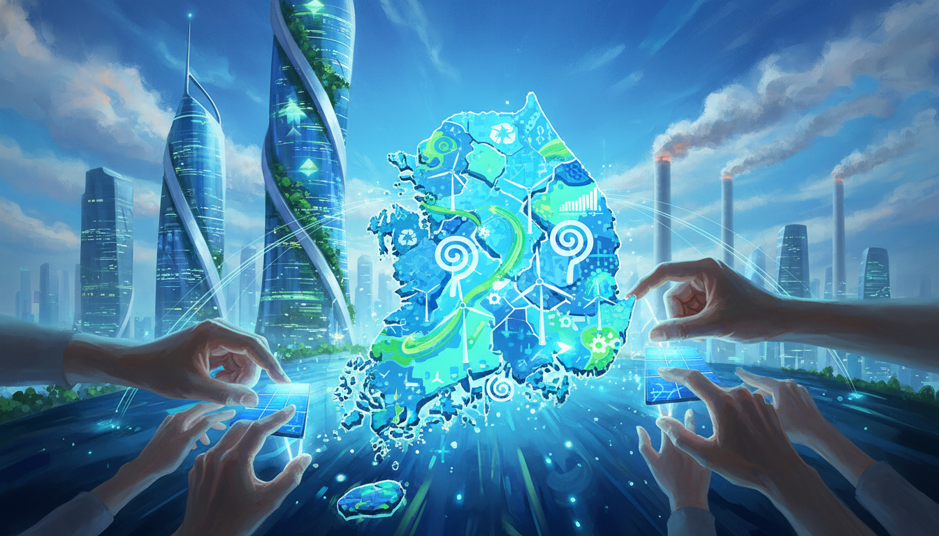 미래지향적인 한국 지도 위에 태양광 패널과 풍력 터빈 등 재생에너지 심볼이 솟아있는 모습