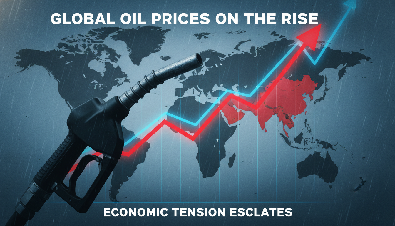 유가 폭등 상황을 상징하는 주유기와 급등하는 유가 그래프, 그리고 중동 지역이 강조된 세계 지도가 어우러진 이미지