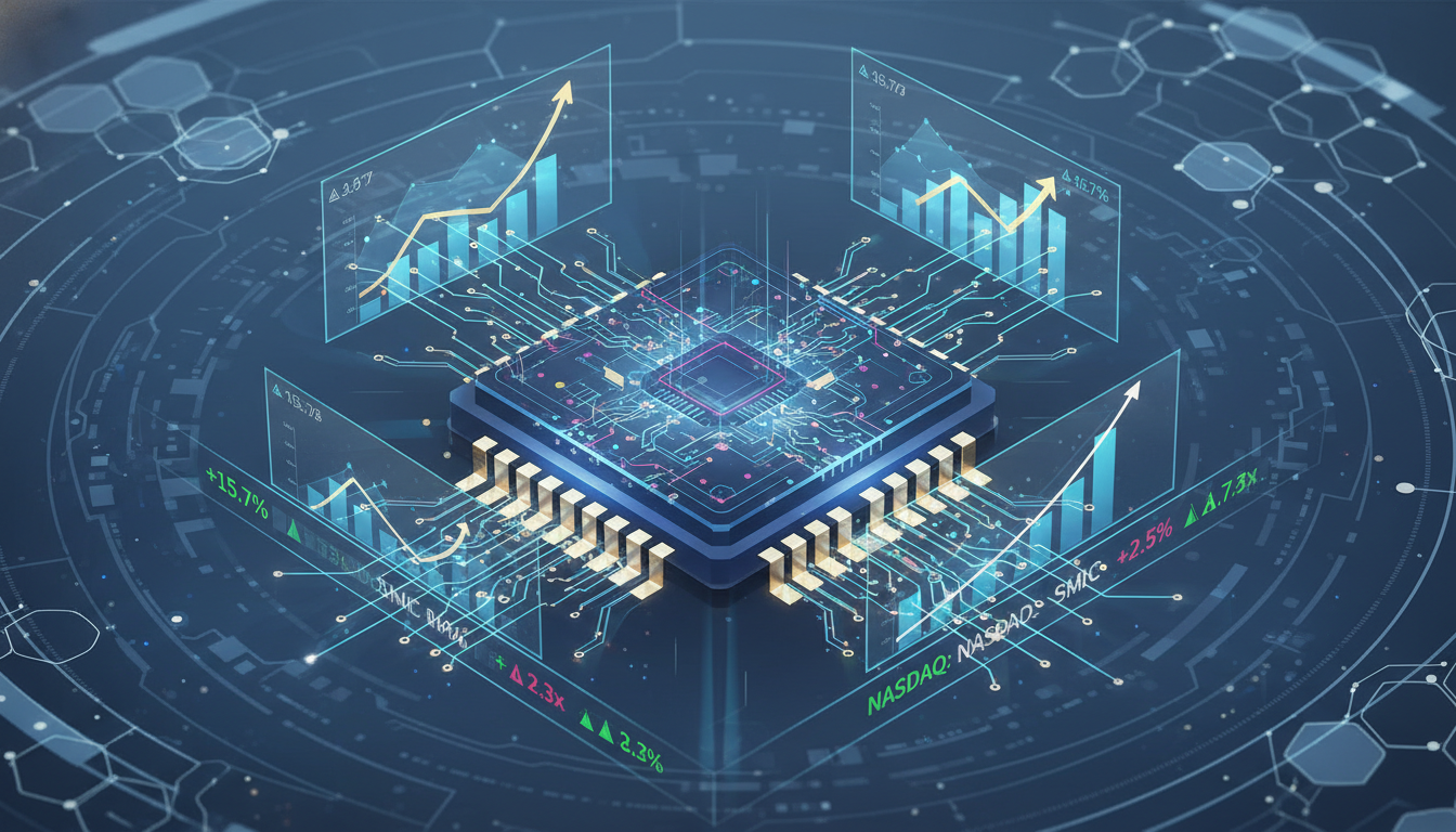 빛나는 회로를 가진 복잡한 반도체 칩 이미지. 상승 그래프와 주식 시장 지표가 함께 있어 반도체 산업의 성장과 기술 발전