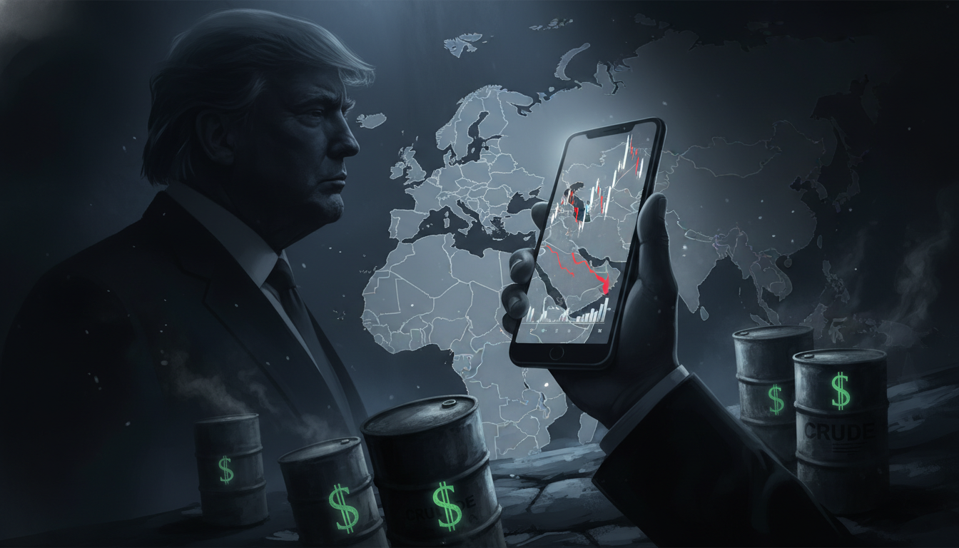 트럼프의 미·이란 휴전 발표 직전 발생한 6400억 원유 선물 내부자 거래 의혹을 상징하는 이미지