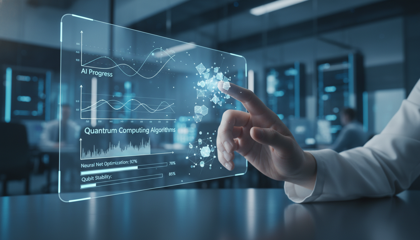 사람의 손이 홀로그램 인터페이스와 상호작용하며 AI 및 양자 컴퓨팅 관련 복잡한 데이터 그래프를 조작하는 모습