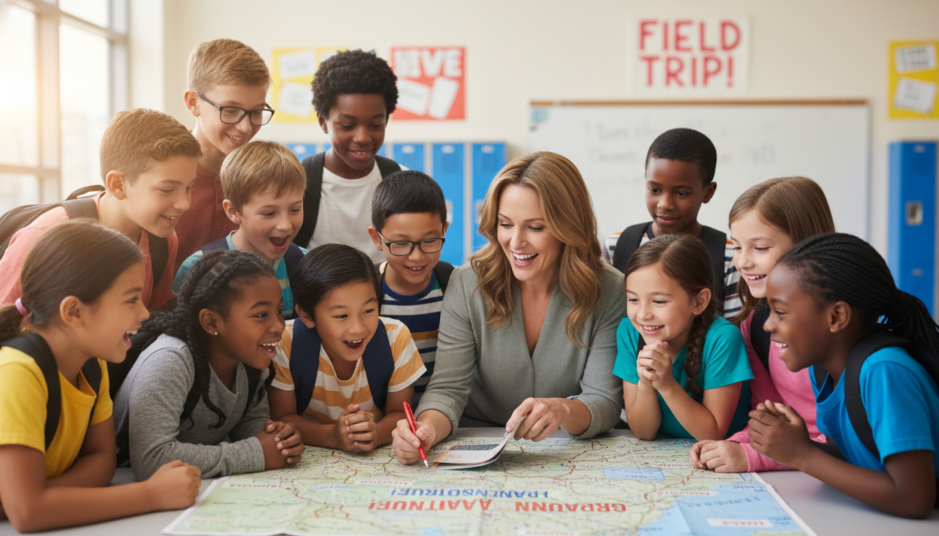 선생님과 학생들이 여행 지도를 보며 소풍 계획을 세우는 활기찬 모습