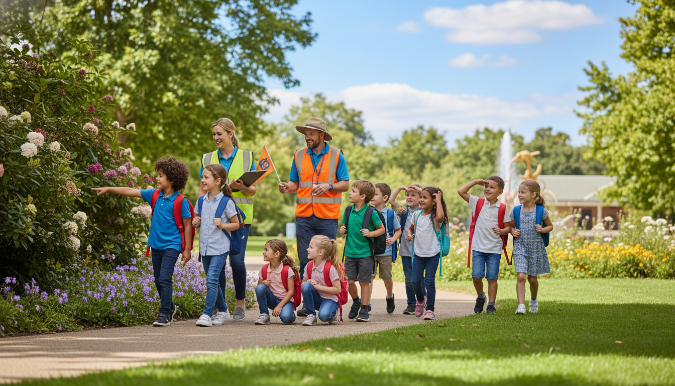 푸른 공원에서 선생님과 안전 요원 인솔 아래 즐겁게 소풍 가는 초등학생들의 활기찬 모습
