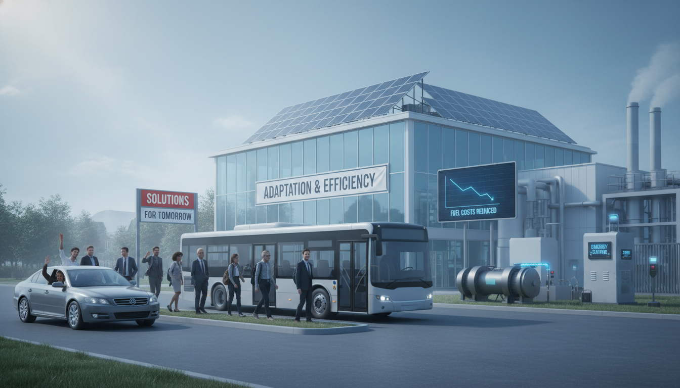 고유가 시대에 개인과 기업이 에너지 절약 및 효율적인 대처 방안을 통해 위기를 극복해나가는 모습을 보여주는 이미지