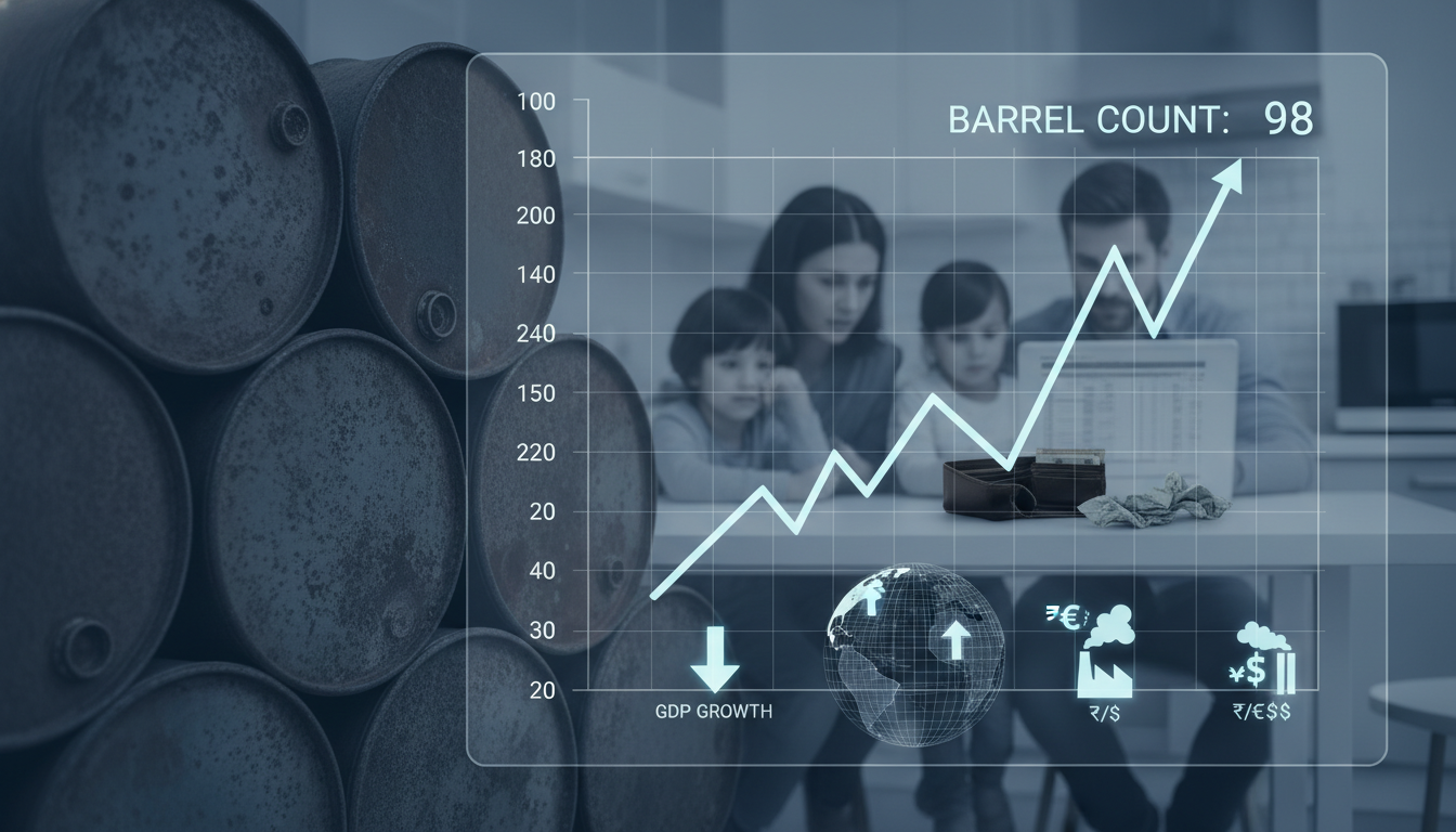 WTI 유가가 100달러에 근접하며 상승하는 모습과 서민 경제에 미칠 부담을 상징하는 이미지