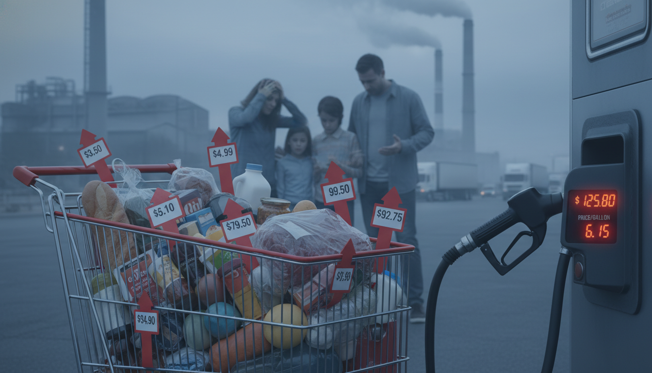 국제유가 상승으로 인해 주유비와 장바구니 물가가 동시에 오르며 서민 가계에 부담이 가중되는 모습을 표현한 이미지