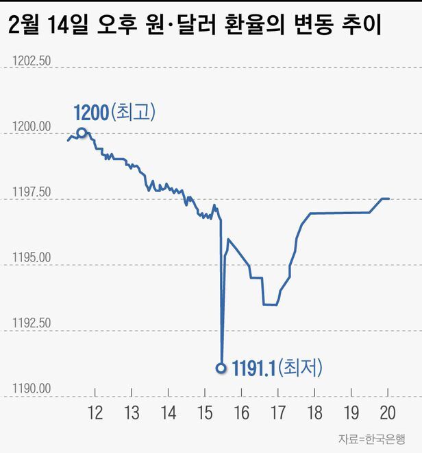 14일 장 마감 직전 미 달러화에 대한 원화 환율이 돌연 급락(달러화 가치 하락)하는 현상이 발생했다. 달러 당 1197원이 넘던 환율이 2~3분 만에 1191원대로 곤두박질 친 것이다.